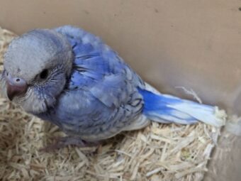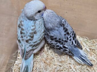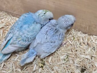 画像1は、ブルースバングルともう1羽は、まだよくわからない色の子です。グレーがかった薄いブルーになりそうです。