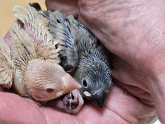 文鳥のシナモン?とノーマル(アゲイトスプリット)のヒナたちです。アゲイト文鳥の親から生まれた兄弟です。