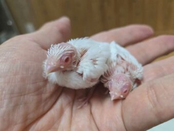 ジュウシマツのアルビノホワイトです。真っ白でなかなかレアな個体です。幼いヒナたちですが、良く慣れていて餌もよく食べています。